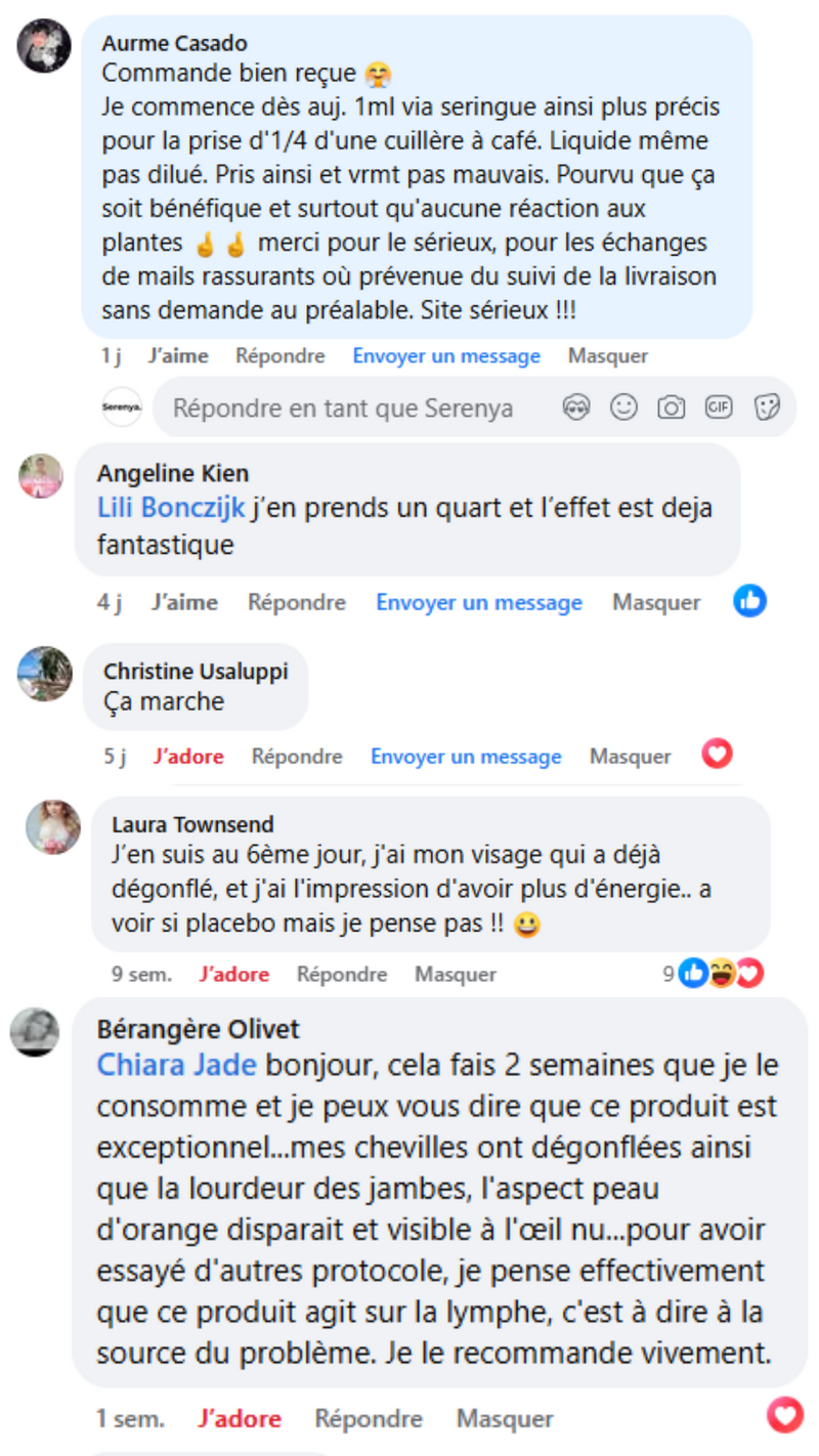 La formule de Serenya repose sur des plantes reconnues pour leur action douce mais efficace sur le système lymphatique. Je la recommande en cas de rétention d’eau, jambes lourdes ou fatigue inexpliquée.